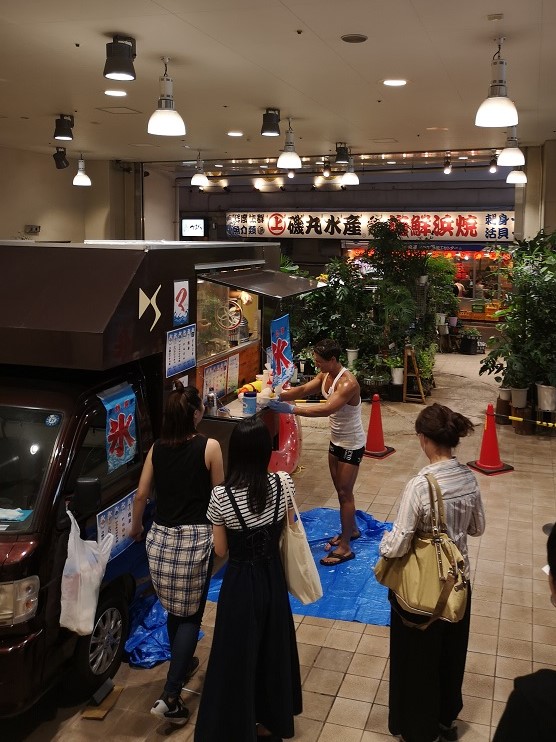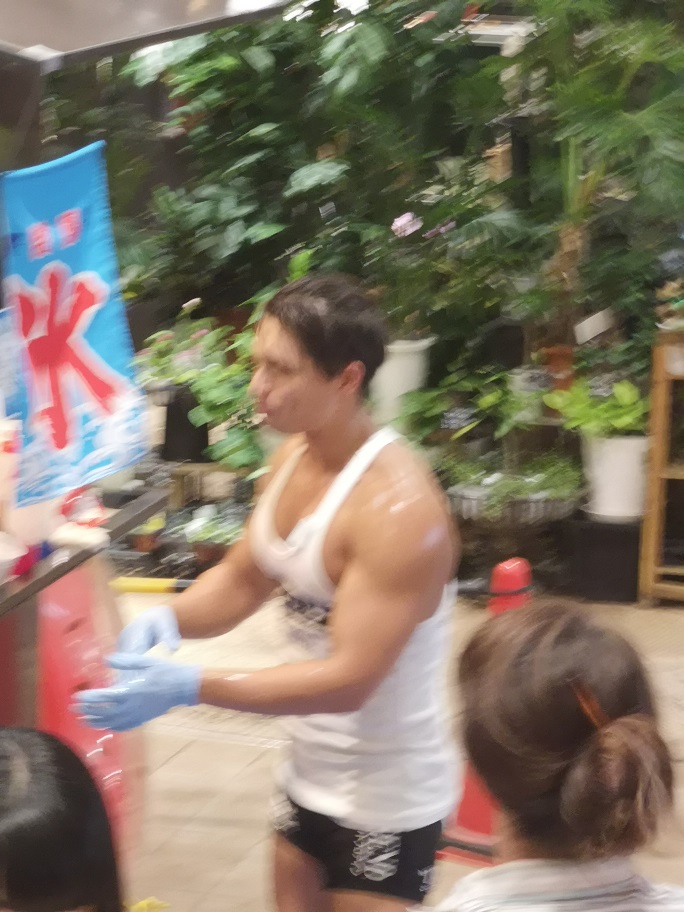 マッチョの男性が電動では無く手動でかき氷を削りそれを別のマッチョ男性が筋肉を見せ、その筋肉を使ってシロップを掛けお客様にかき氷を提供しておりました。