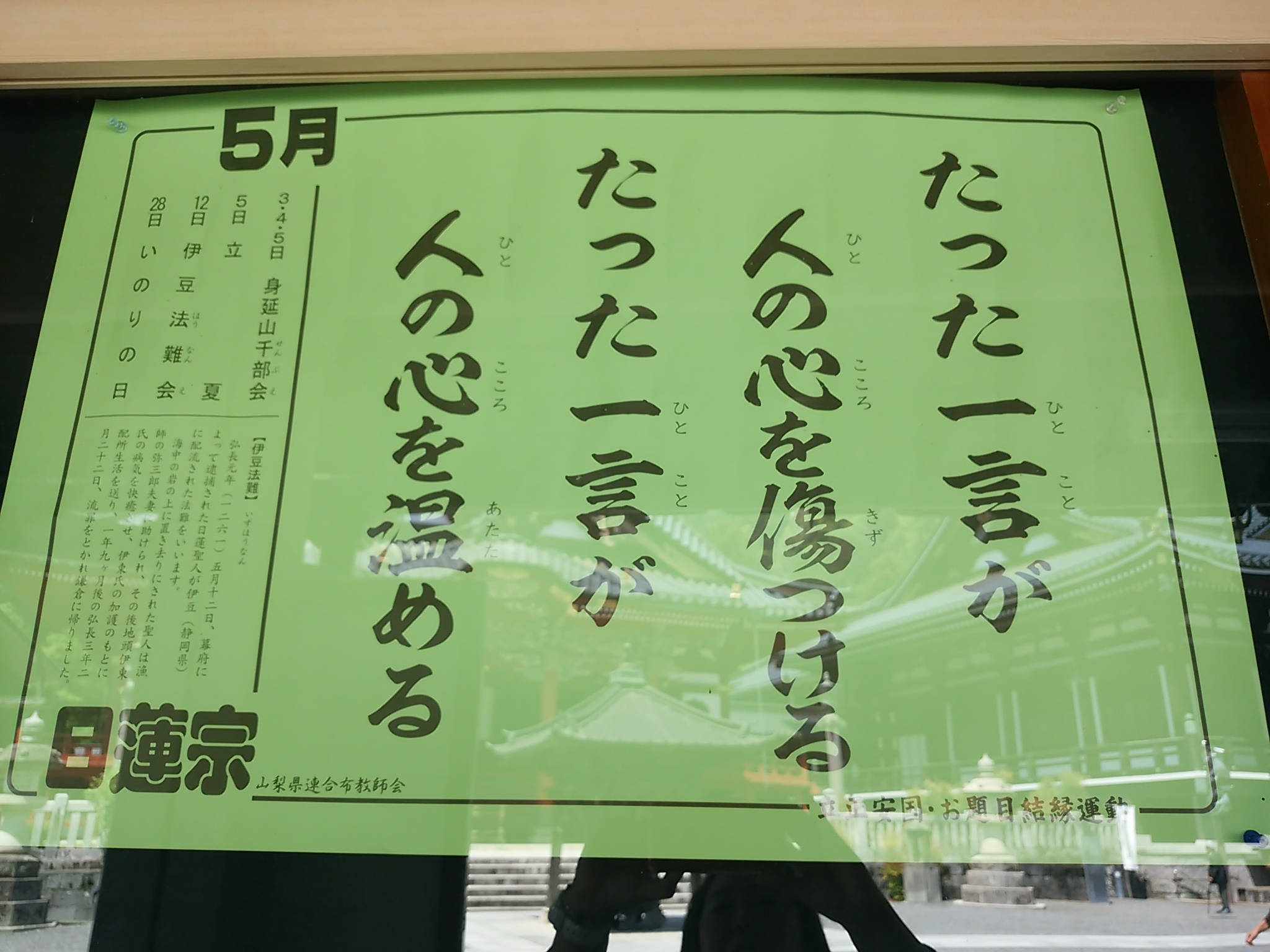 先日 身延山久遠寺へ行って来ました 社務所にてこちらが貼ってありまして わかってはおりますが・・・ 脳と口が直結しているらしく・・・ 言い訳ですね 5月も残り少ないですが心して参ります 総務経理 堂本でした