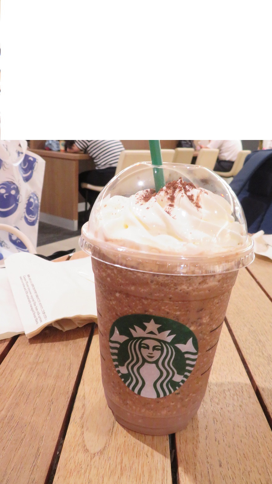 こんにちはnakanoです。 さて本日のティータイムは久しぶりにスタバさんへと行ってみました。 いただいたお飲み物は「ダークモカチィップクリームフラペチーノのGrande」です。 ミルク.チョコレートチップ.氷が織りなす甘さの中にも苦味がありスイーツ好きにはたまらない一品でした。 たまの休日スタバさんで贅沢なティータイムをすごさせていただきました。 それではまた。