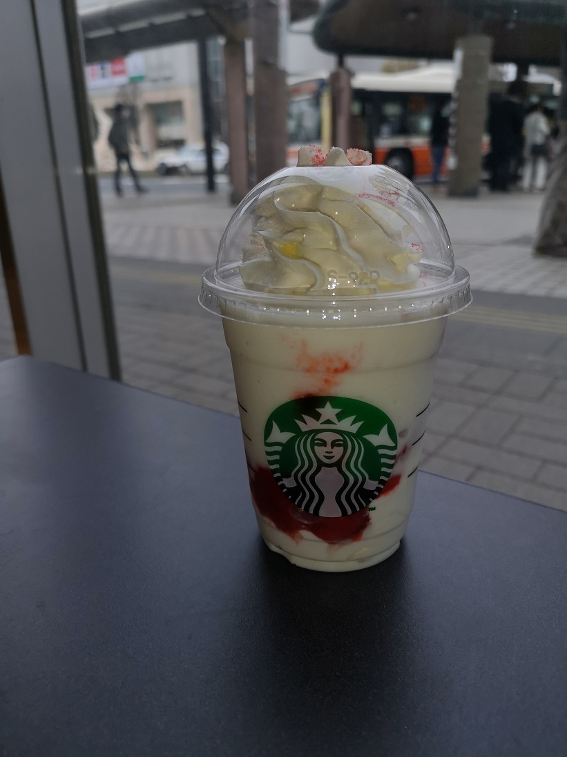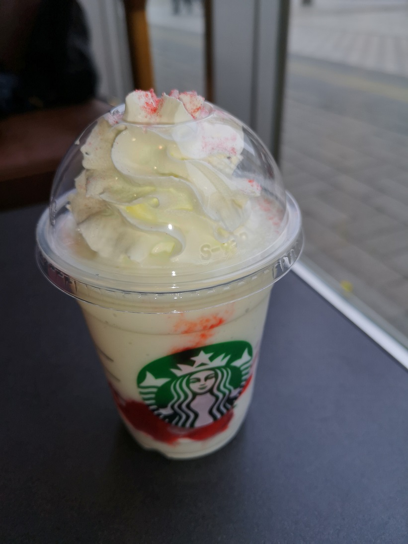 こんにちはnakanoです。 本日のスタバは「ストロベリーマッチ・フラペチーノ ホワイト」です。 お味の方は見ての通り甘口です。中にストロベリーマカロンとストロベリーの果肉が砕いて入っており、マカロンのサクサク感や果肉の果物感がとても美味しく感じられました。次回はレッドをいってみようと思います。 それでは皆様次回お会いしましょう。